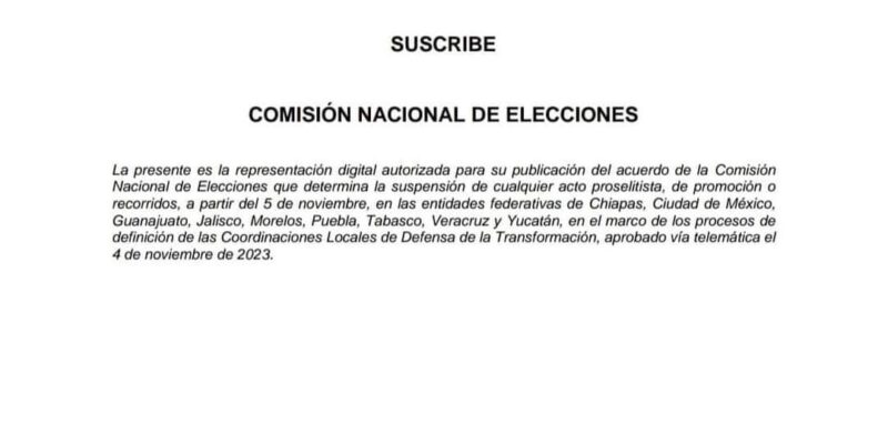 La Comisión Nacional de Elecciones de Morena, determina la suspensión de cualquier acto proselitista, de promoción o recorridos, a partir del 5 de noviembre en Puebla, Chiapas, CDMX, Guanajuato, Jalisco, Morelos, , Tabasco, Veracruz y Yucatán.