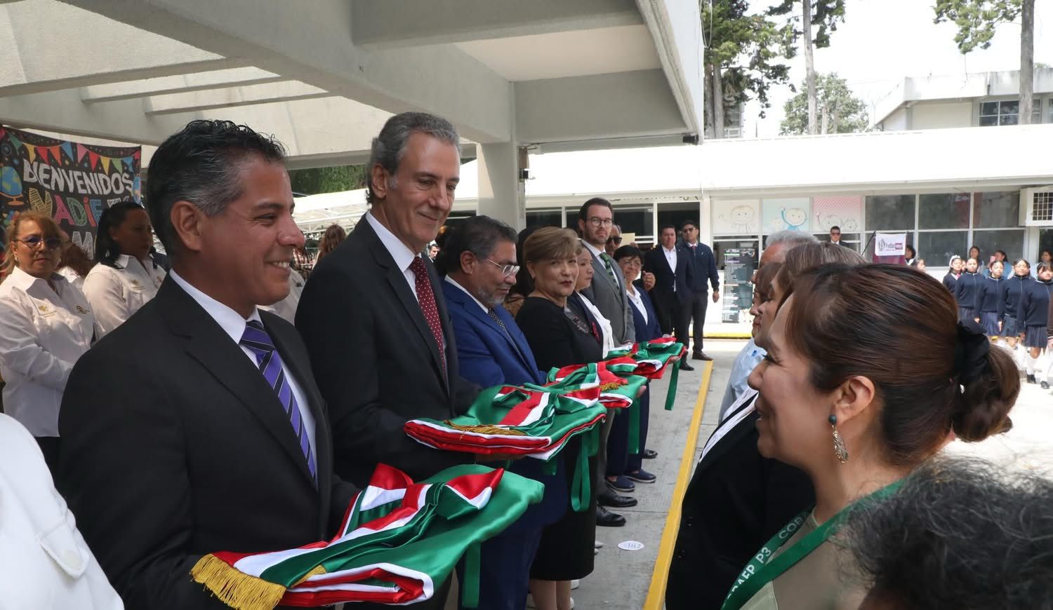 Durante el evento, el alcalde dio banderas de manera simbólica a 14 escuelas, donde participaron 5 escoltas que recibieron el Lábaro Patrio de forma directa. El programa contempla la entrega de 100 kits y banderas a escuelas, juntas auxiliares e inspectorías.