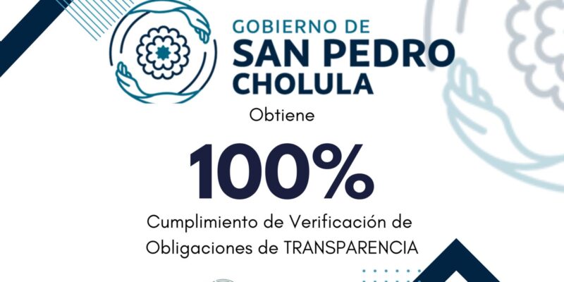 San Pedro Cholula, Pue. – El Gobierno de San Pedro Cholula, que preside Paola Angon Silva, obtuvo el 100% en el cumplimiento de la Verificación de Obligaciones de Transparencia 2024, que emite el Instituto de Transparencia, Acceso a la Información Pública y Protección de Datos Personales del Estado de Puebla (ITAIPUE), por segunda ocasión.