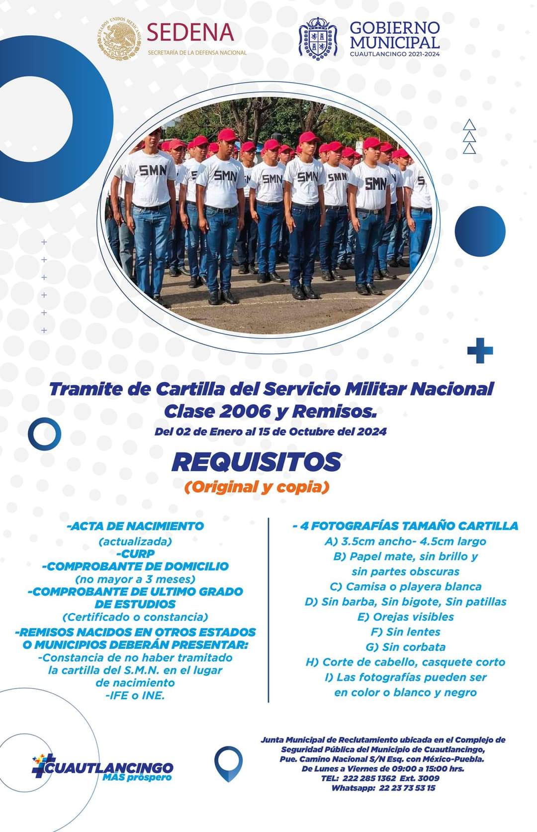 Municipios GOBIERNO MUNICIPAL DE CUAUTLANCINGO PUEBLA TE INVITA Por Redacción 13 junio, 2024161 bbb CompartirTweet 0 Tramita tu Cartilla del Servicio Militar Nacional. Clase 2005 y Remisos pueden acudir de Lunes a Viernes a las oficinas del Complejo de Seguridad Pública de 9:00 a 17:00 hrs. Consulta los requisitos 👇