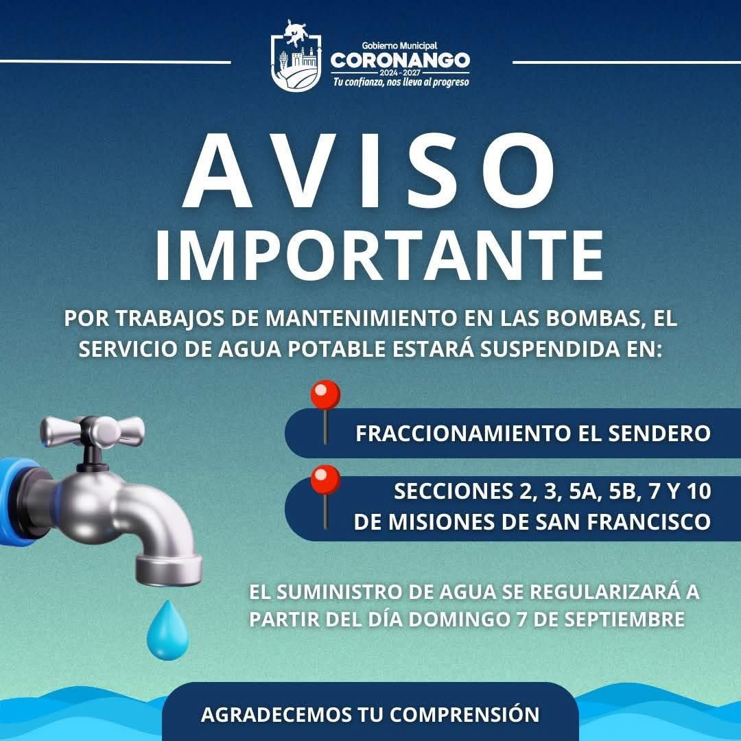 #AvisoImportante 💧| Debido a trabajos de mantenimiento en las bombas a cargo de la Dirección de Agua Potable de #Coronango, el servicio de ...