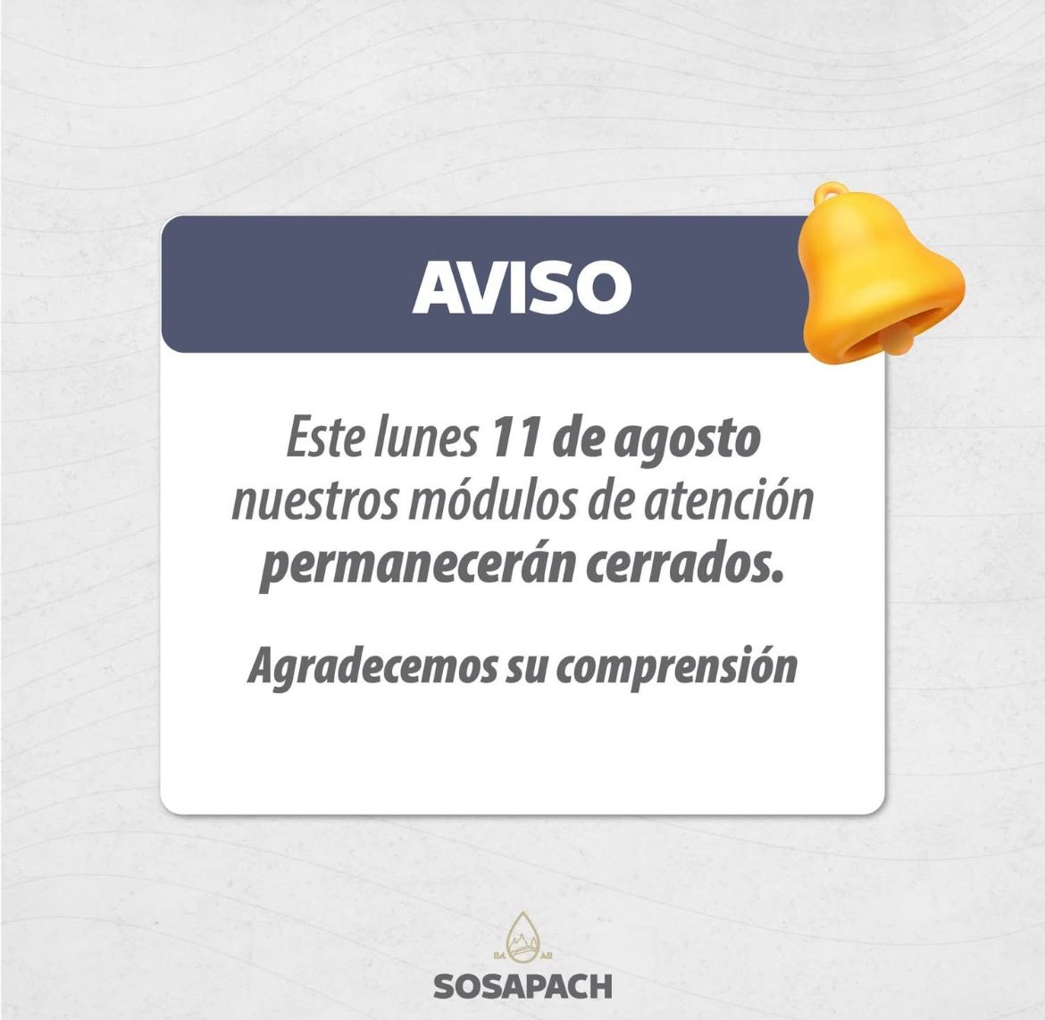 Aviso a nuestras y nuestros usuarios Este lunes 11 de agosto no habrá atención en nuestros módulos de pago y servicio. El día ...