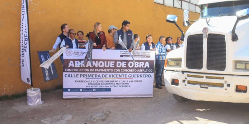 San Pedro Cholula, Puebla.- Con el compromiso de continuar ejecutando obras con sentido social que responden a las necesidades de las familias, la Presidenta Municipal Paola Angon, dio banderazo al inicio de obra de la calle Primera de Vicente Guerrero en la junta auxiliar de Santiago Momoxpan en la que se pavimentarán con concreto asfáltico, cerca de 500 metros cuadrados.