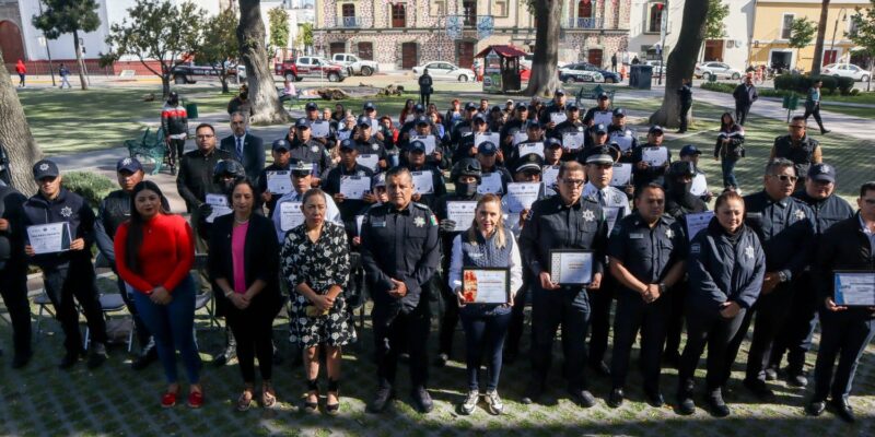 “A nombre de todos los cholultecas les puedo decir que estamos orgullosos de cada uno de ustedes por todo el trabajo que realizan, que gracias a ustedes San Pedro Cholula vuelve a ser un municipio seguro, mi reconocimiento y respeto”, indicó a los policías reconocidos por acciones destacadas y nuevos elementos.