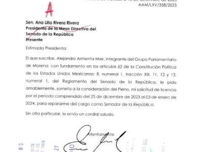 El senador Alejandro Armenta solicitó licencia para separarse de su cargo, del 25 de diciembre de 2023 al 3 de enero de 2024.