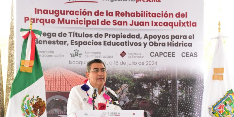 * En Ixcaquixtla, el mandatario presidió la inauguración de la rehabilitación del Parque Municipal, así como el otorgamiento de beneficios para el bienestar, títulos de propiedad y certificados de construcción de espacios educativos.