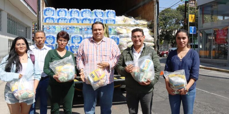 Las despensas enviadas a los damnificados cuentan con agua embotellada, comida enlatada, frijol, arroz, harina, leche, alimentos no perecederos, amaranto, galletas de trigo, entre otros.