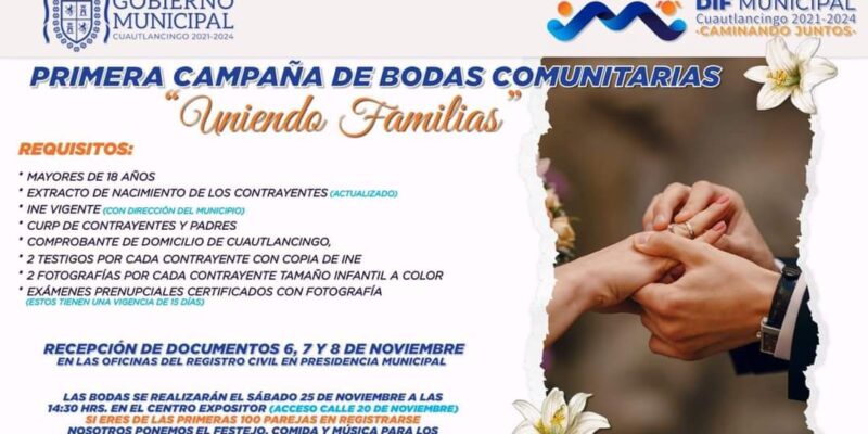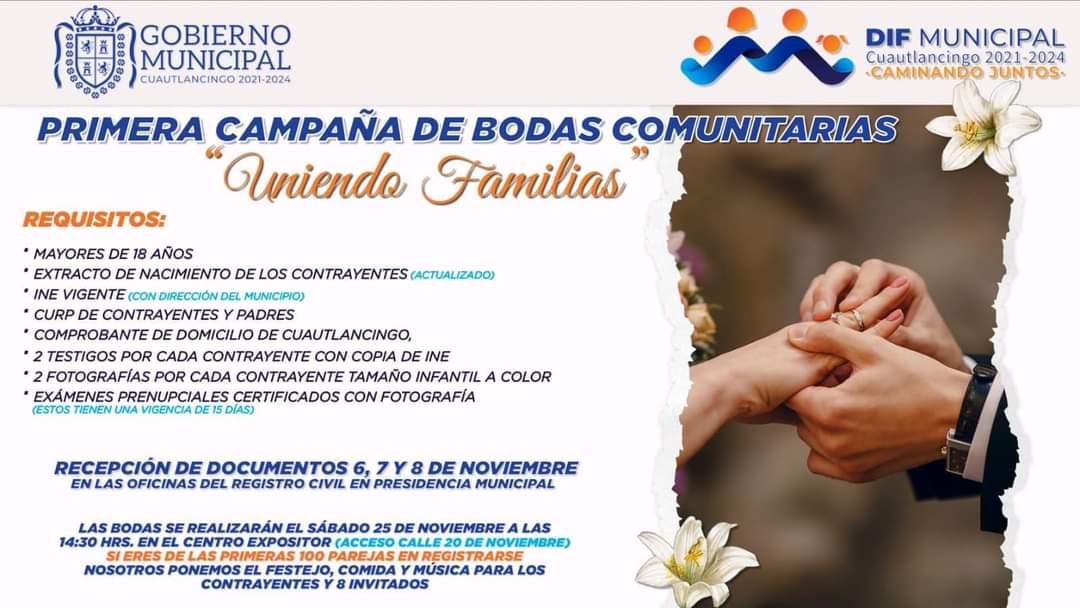 Recuerda, si eres de San Lorenzo Almecatla, Sanctorum, Chautenco o de alguna colonia o barrio de Cuautlancingo y estás planeando tu boda, tú puedes ser parte de nuestro programa “Uniendo Familias”.