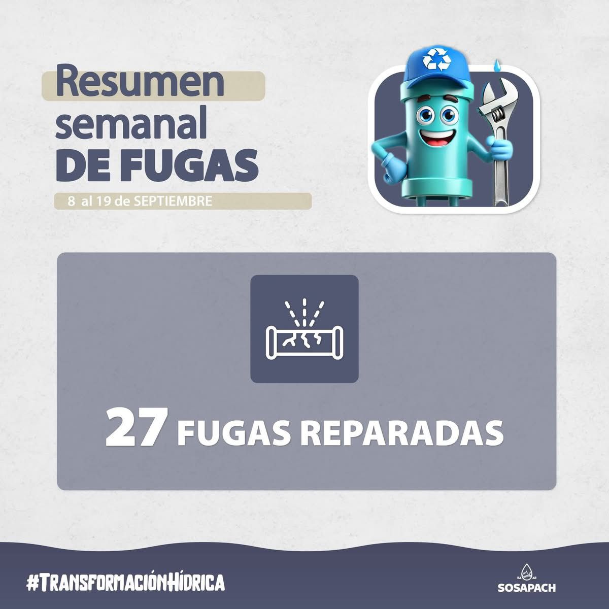 Reporte de fugas reparadas; Del 8 al 19 de septiembre, nuestro equipo operativo atendió un total de 27 fugas en distintos puntos de Cholula, lo que representa un promedio de 2.4 fugas reparadas por día laboral.
